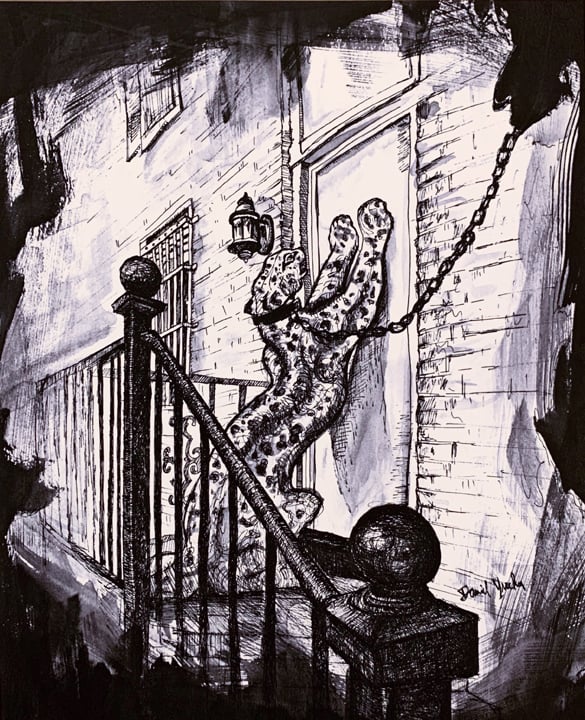 The original image was done completely in black and white with pen and ink on cold press illustration board. I later scanned in the image and digitally "painted" the image in Photoshop, a process I use as a method of creating color comps for other images.